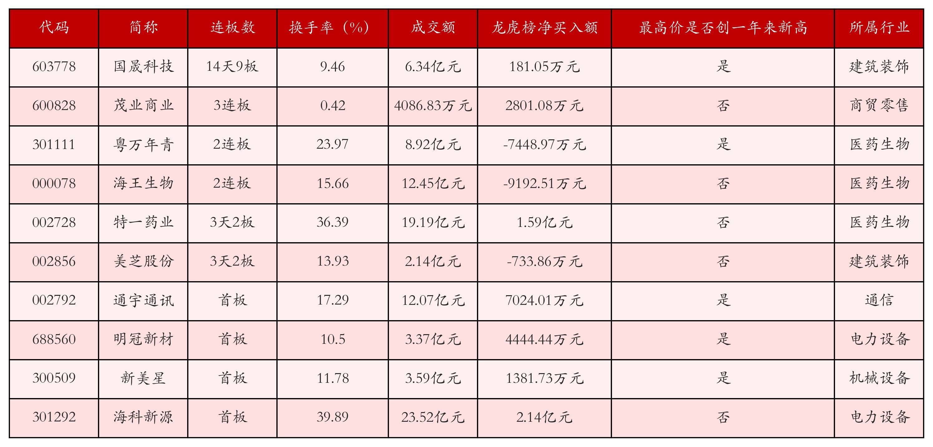 截至11月27日收盘,上证综指上涨0.29%,收于3875.26点,深证成指下跌0.25%,收于12875.19点,创业板指下跌0.44%,收于3031.3点。今日沪深两市A股共计63只涨停,综合当前连板数以及当日龙虎榜数据,其中较为强势的前三只个股分别为:国晟科技(603778)、茂业商业(600828)与粤万年青(301111)。今日强势个股前10位具体数据见下表: